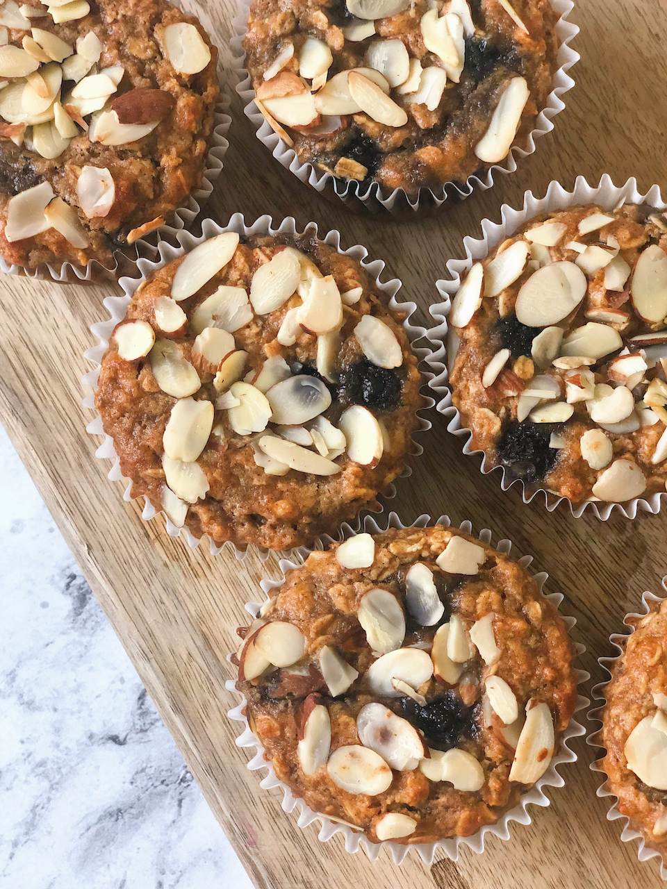 In a large bowl, combine the oats, almond flour, baking powder, baking soda, salt and cinnamon. Pour the wet ingredients into the dry ingredients and whisk until all combined. Gently fold in the blueberries, being careful not to over mix or blueberries will get smashed.